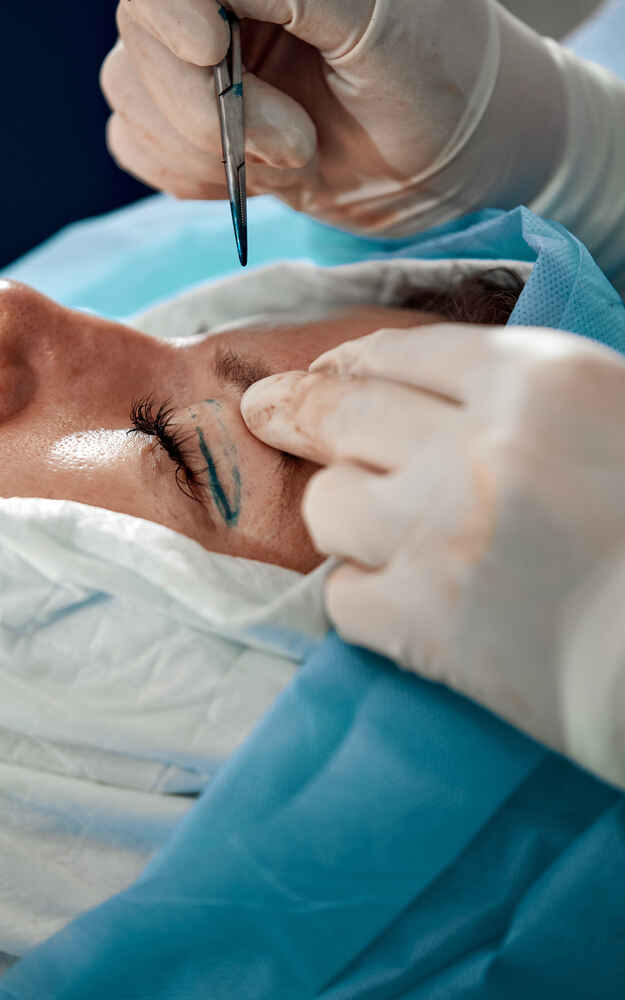 Eyelid surgery (Blepharoplasty) rejuvenates the eyes by removing excess skin, fat, or muscle from the upper or lower eyelids. A brow lift corrects sagging brows and forehead wrinkles, restoring a more open and youthful look.